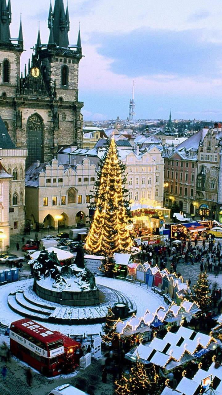 Обои староместская площадь, пражские астрономические часы, Рождественский рынок, ориентир, город для HD Samsung Galaxy S3/J3/J4/J5, Meizu M5, Sony Xperia L1/L2, заставка, 720x1280 картинка