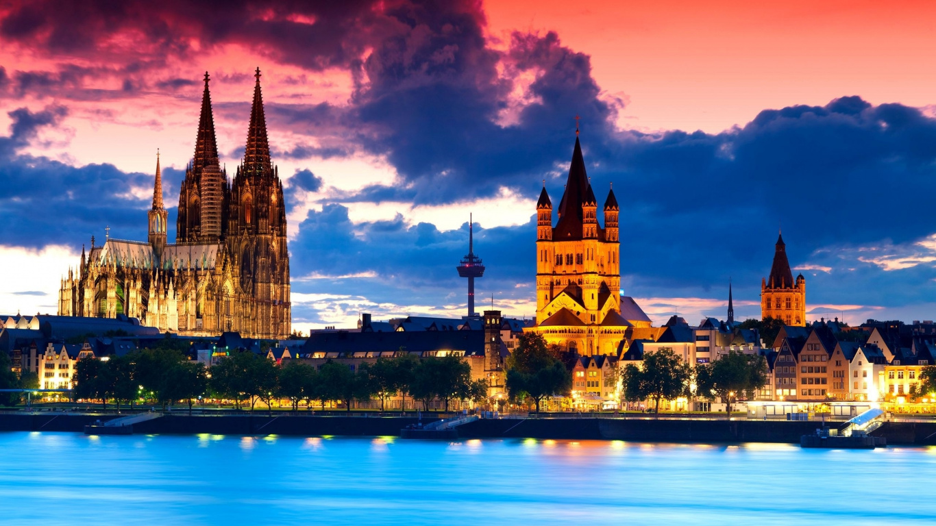 Обои 1366x768 Кельнский Собор, ориентир, город, отражение, городок, HD ready картинка