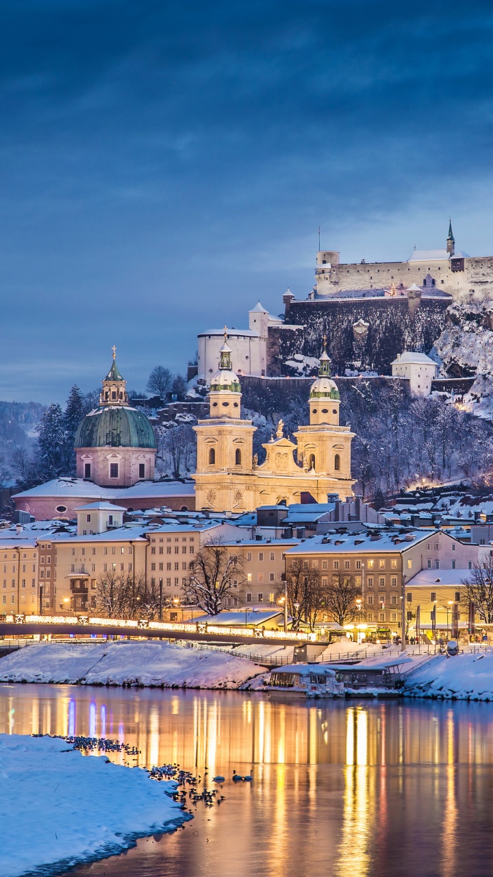 Обои городок, замок, зима, город, отражение для HD Samsung Galaxy S3/J3/J4/J5, Meizu M5, Sony Xperia L1/L2, заставка, 720x1280 картинка