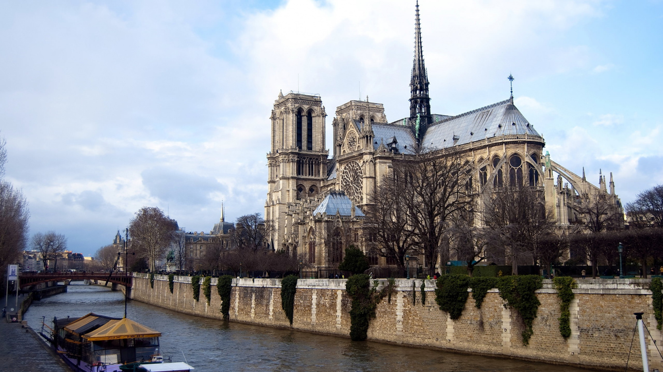 Обои 1366x768 НотрДам де Пари, водный путь, собор, здание, церковь, HD ready картинка