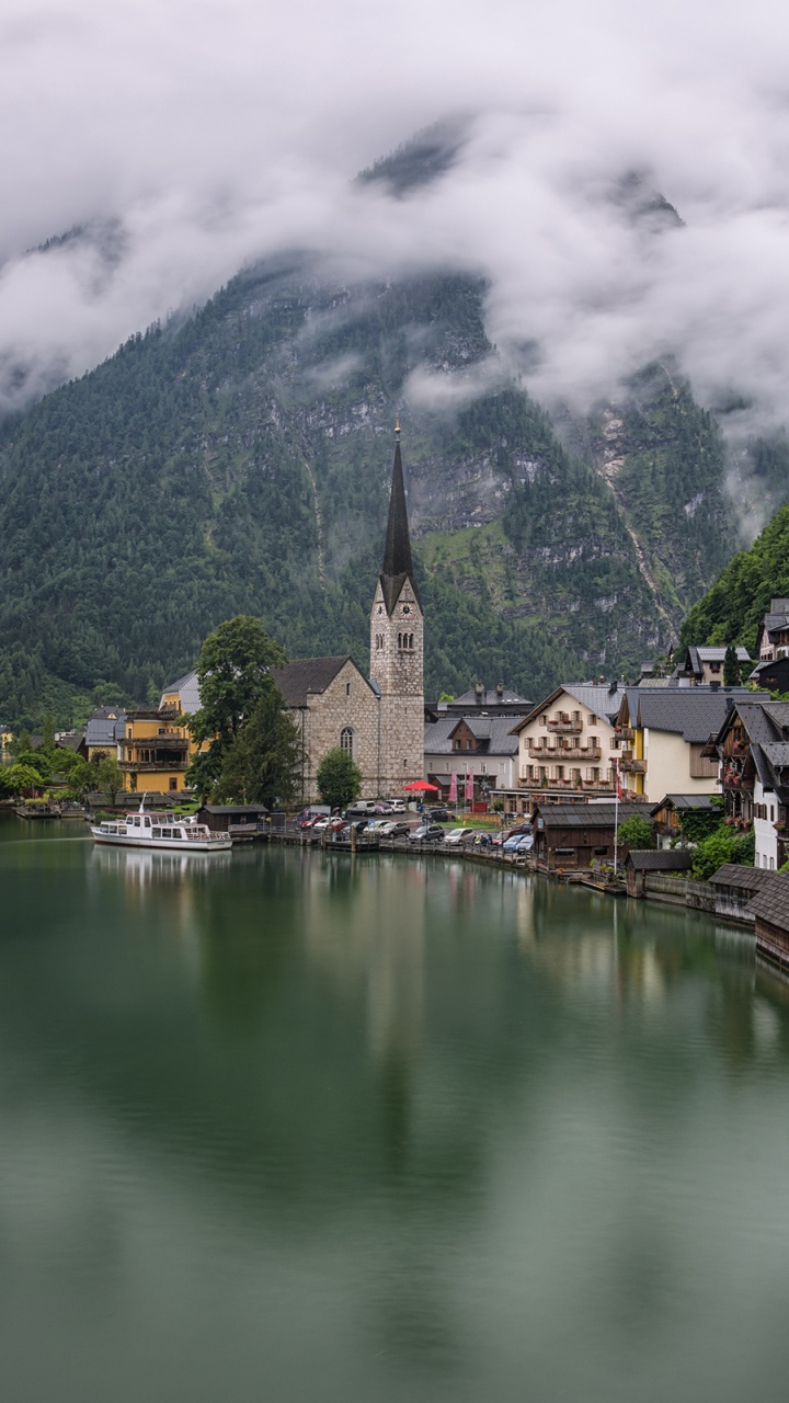 Обои гальштат, озеро, природа, горная деревня, гора для HD Samsung Galaxy S3/J3/J4/J5, Meizu M5, Sony Xperia L1/L2, заставка, 720x1280 картинка
