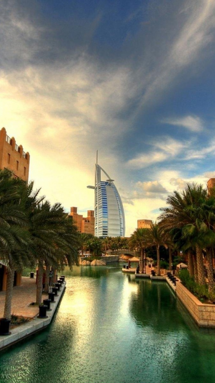Обои Бурдж Аль араб, Бурдж Халифа, вода, дерево, Пальма для HD Samsung Galaxy S3/J3/J4/J5, Meizu M5, Sony Xperia L1/L2, заставка, 720x1280 картинка