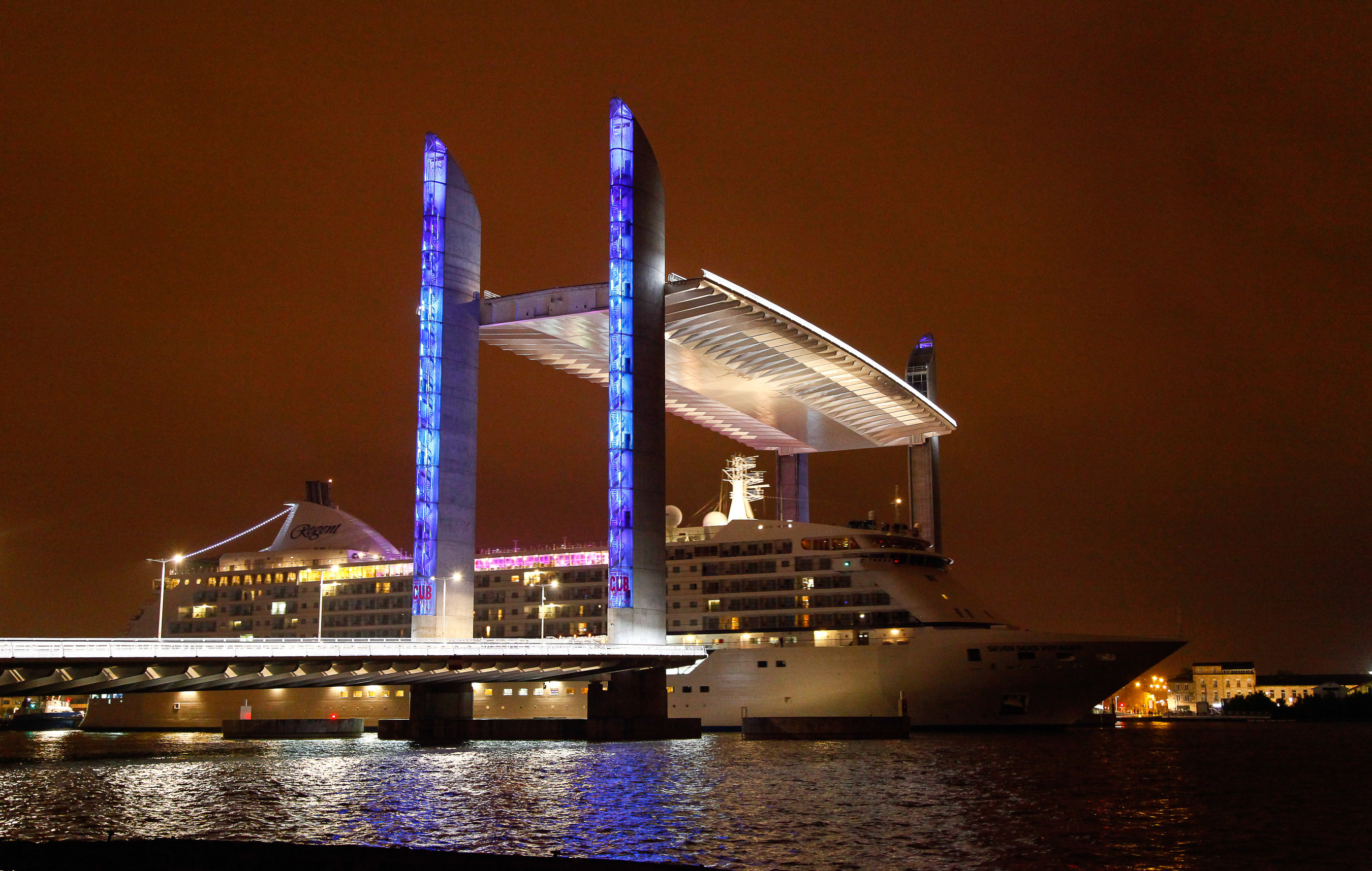 Обои мост, ночь, архитектура, роскошная яхта, Понт Жак Шабан-Дельмас, фото, заставка