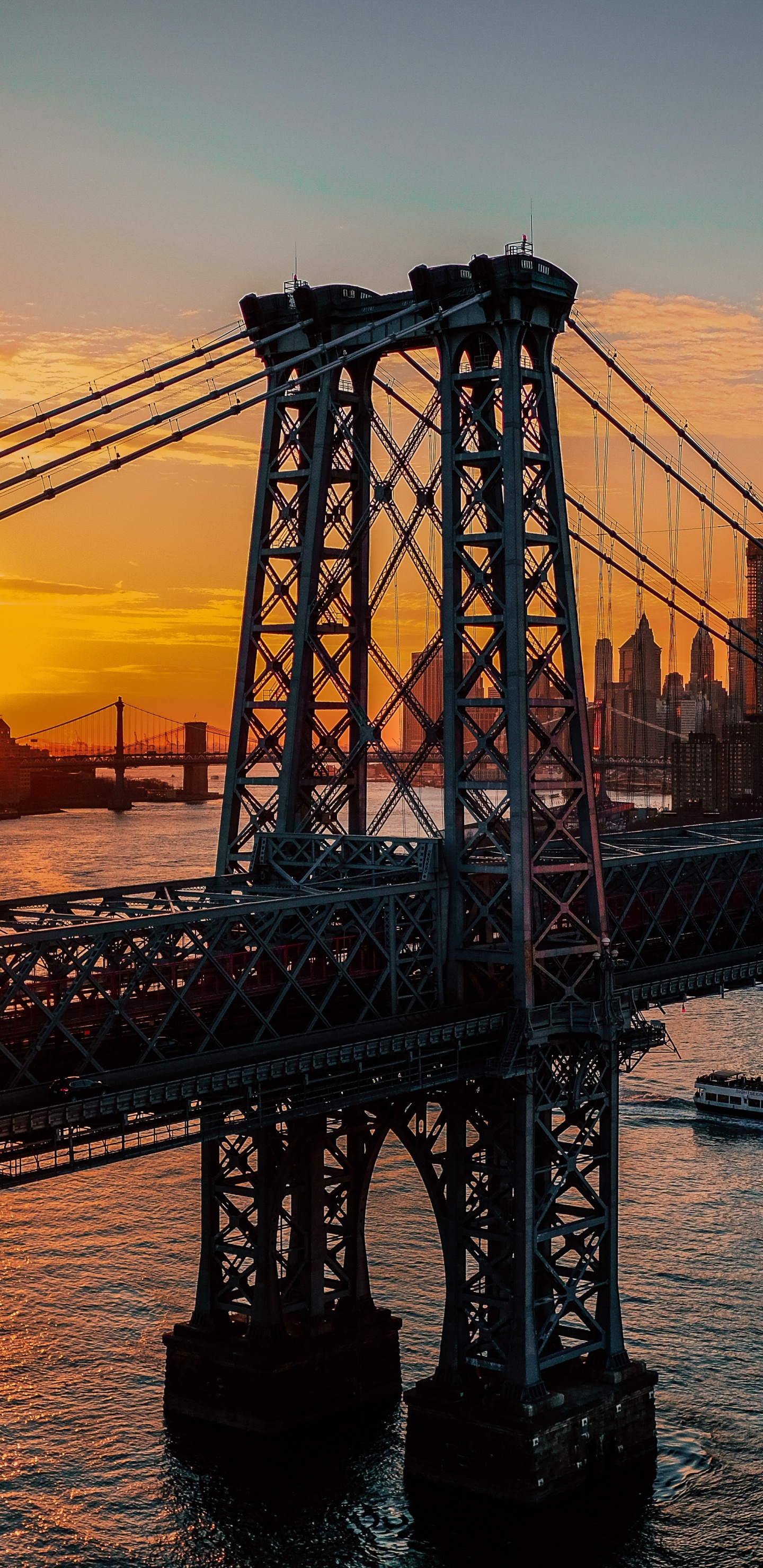 Обои Вильямсбургский Мост, Бруклинский мост, мост, подвесной мост, сумрак для Samsung Galaxy S8/S8+/S9/S9+/Note 8/Note 9 QHD, заставка, 1440x2960 картинка