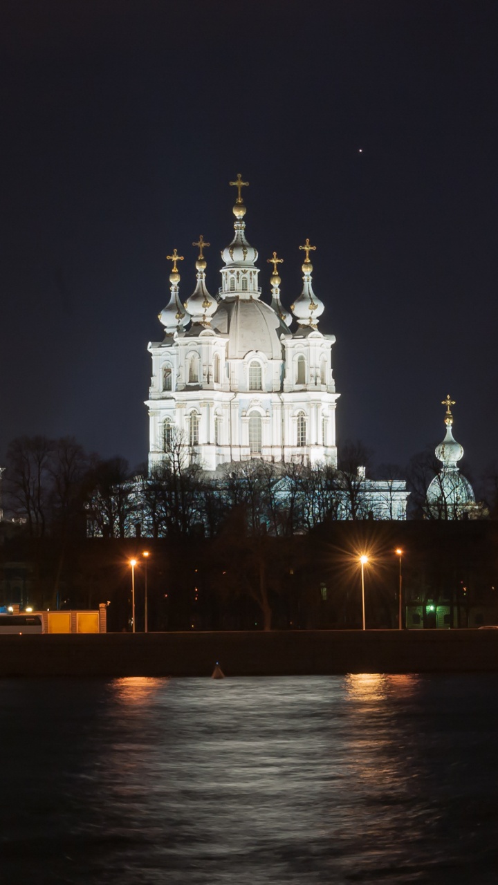 Обои Смольный монастырь, ночь, ориентир, вода, город для HD Samsung Galaxy S3/J3/J4/J5, Meizu M5, Sony Xperia L1/L2, заставка, 720x1280 картинка