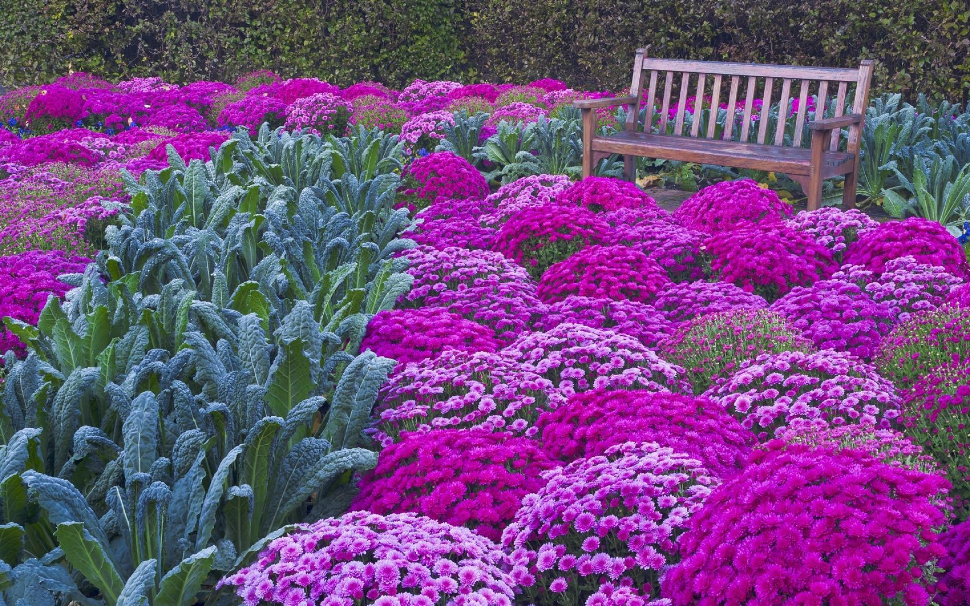Обои скамейка, сад, цветковое растение, растение, пурпур, фото, заставка
