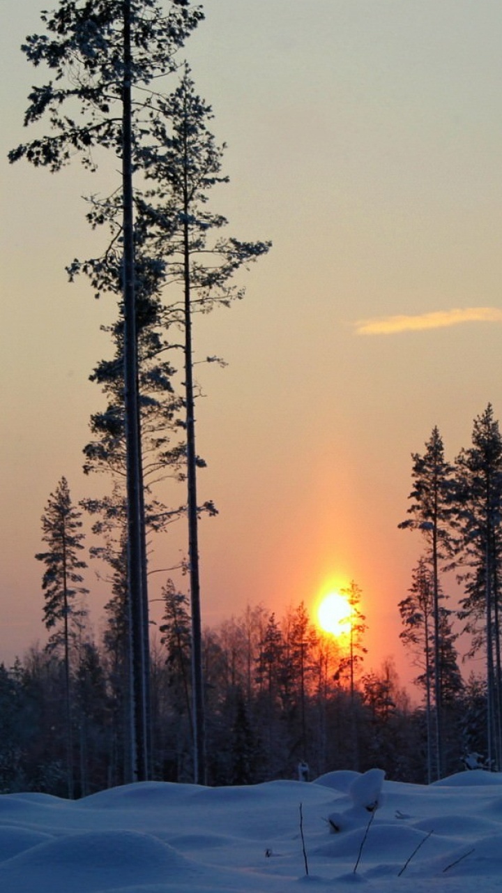 Обои закат, лес, зима, снег, восход солнца для HD Samsung Galaxy S3/J3/J4/J5, Meizu M5, Sony Xperia L1/L2, заставка, 720x1280 картинка