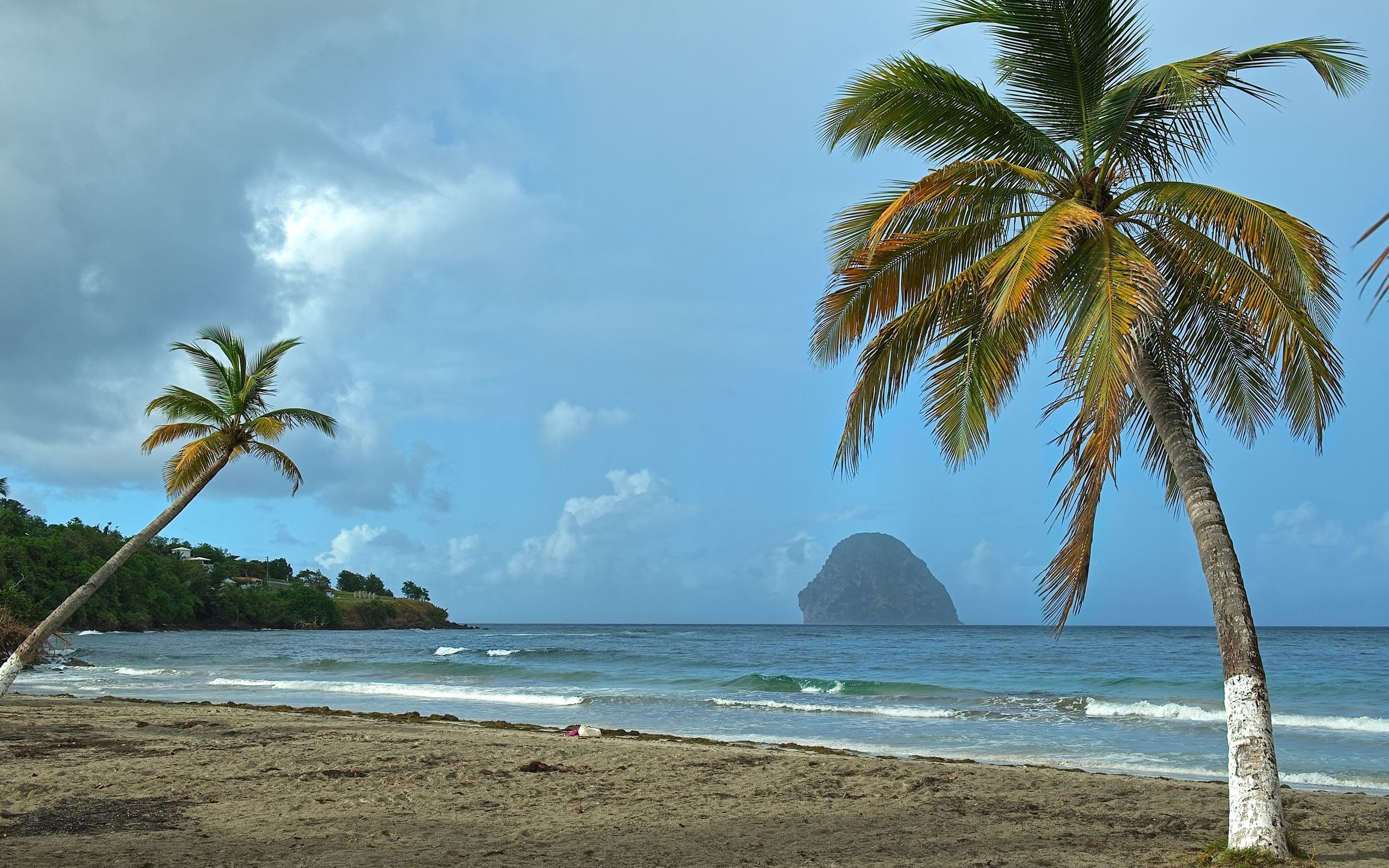 Обои море, пляж, пальмовые рощи, берег, тропическая зона, фото, заставка
