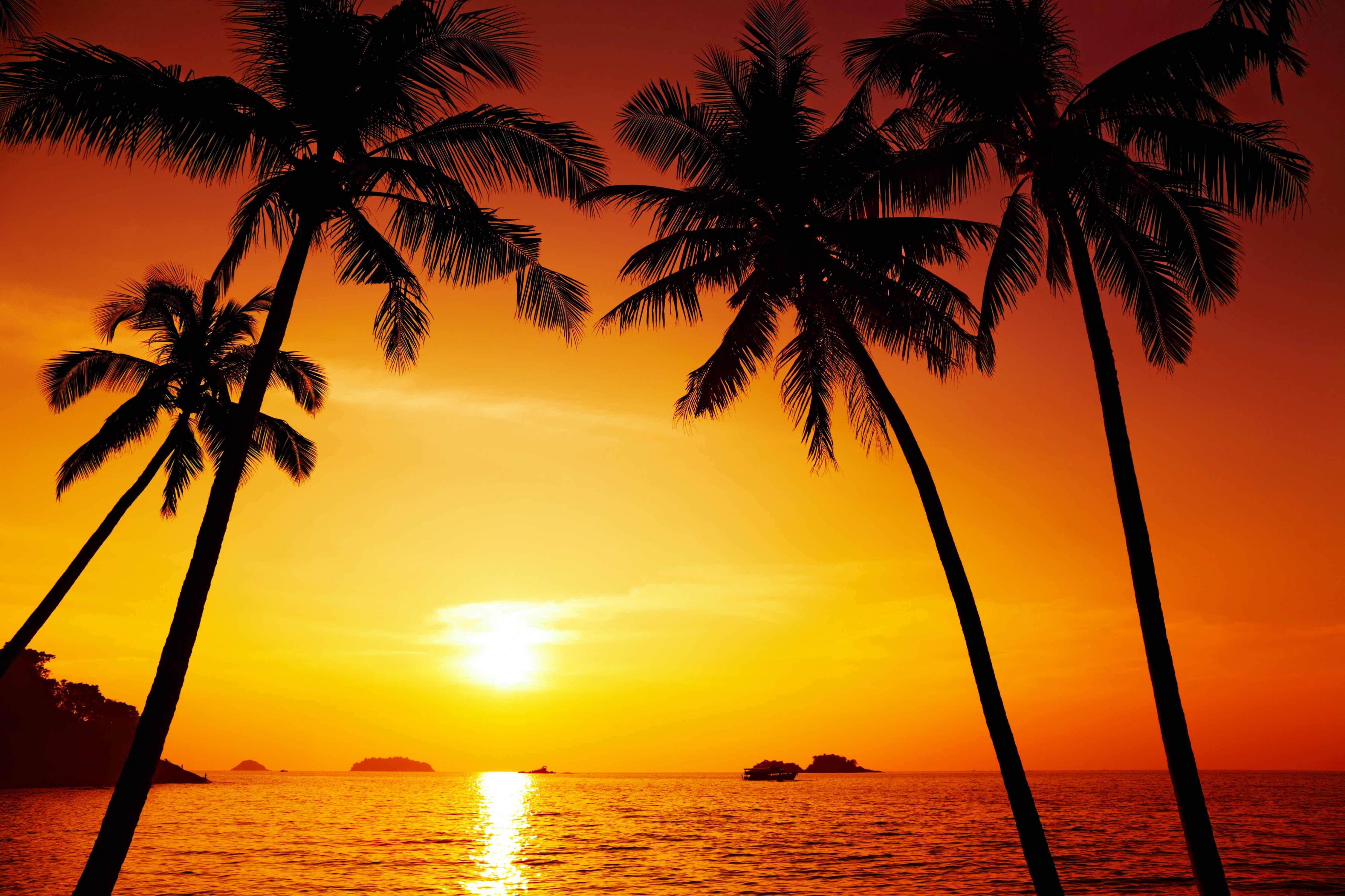 Обои закат, дерево, тропическая зона, Пальма, послесвечение, фото, заставка