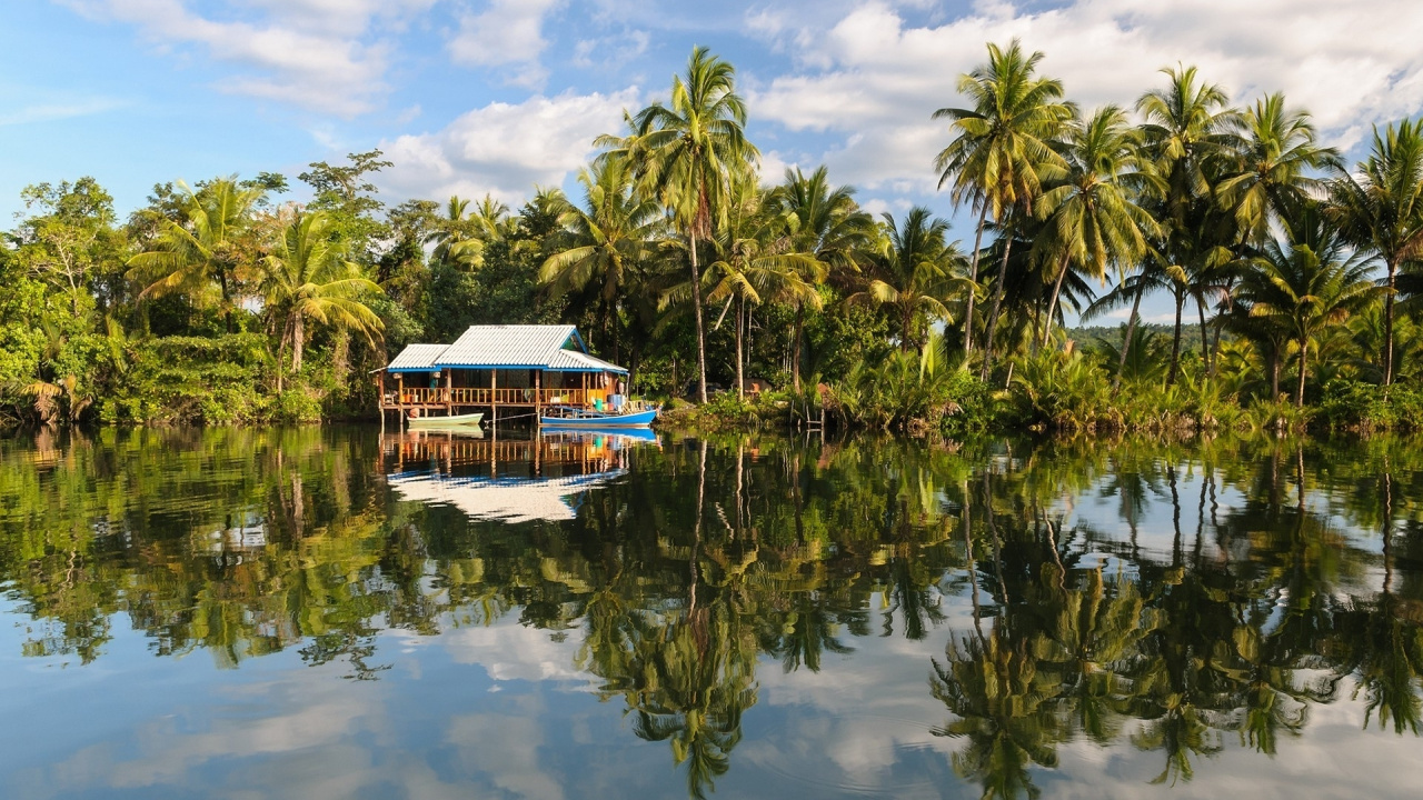 Обои 1280x720 отражение, дерево, Пальма, водный путь, болото, HD, HDV, 720p, 16:9 картинка