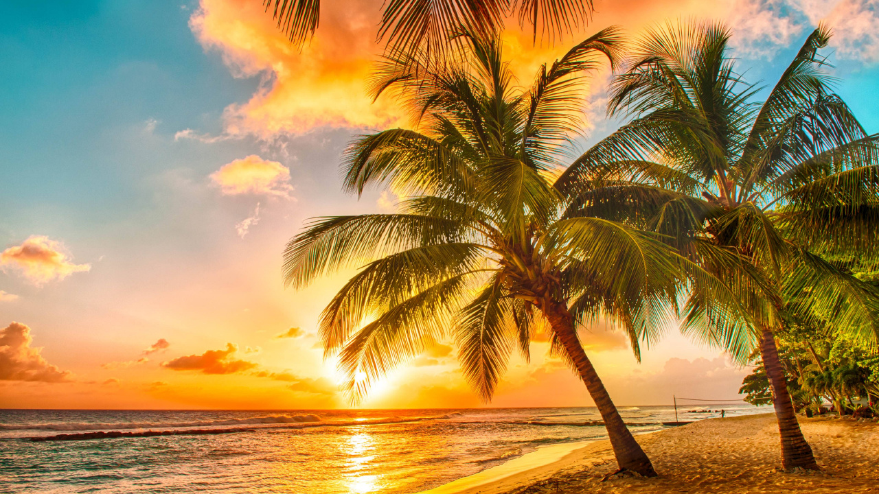 Обои 1280x720 пляж, закат, море, природа, тропическая зона, HD, HDV, 720p, 16:9 картинка