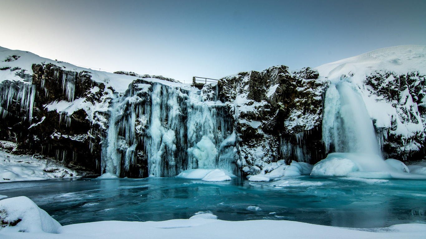 Обои 1366x768 водопад, снег, водоем, вода, природа, HD ready картинка
